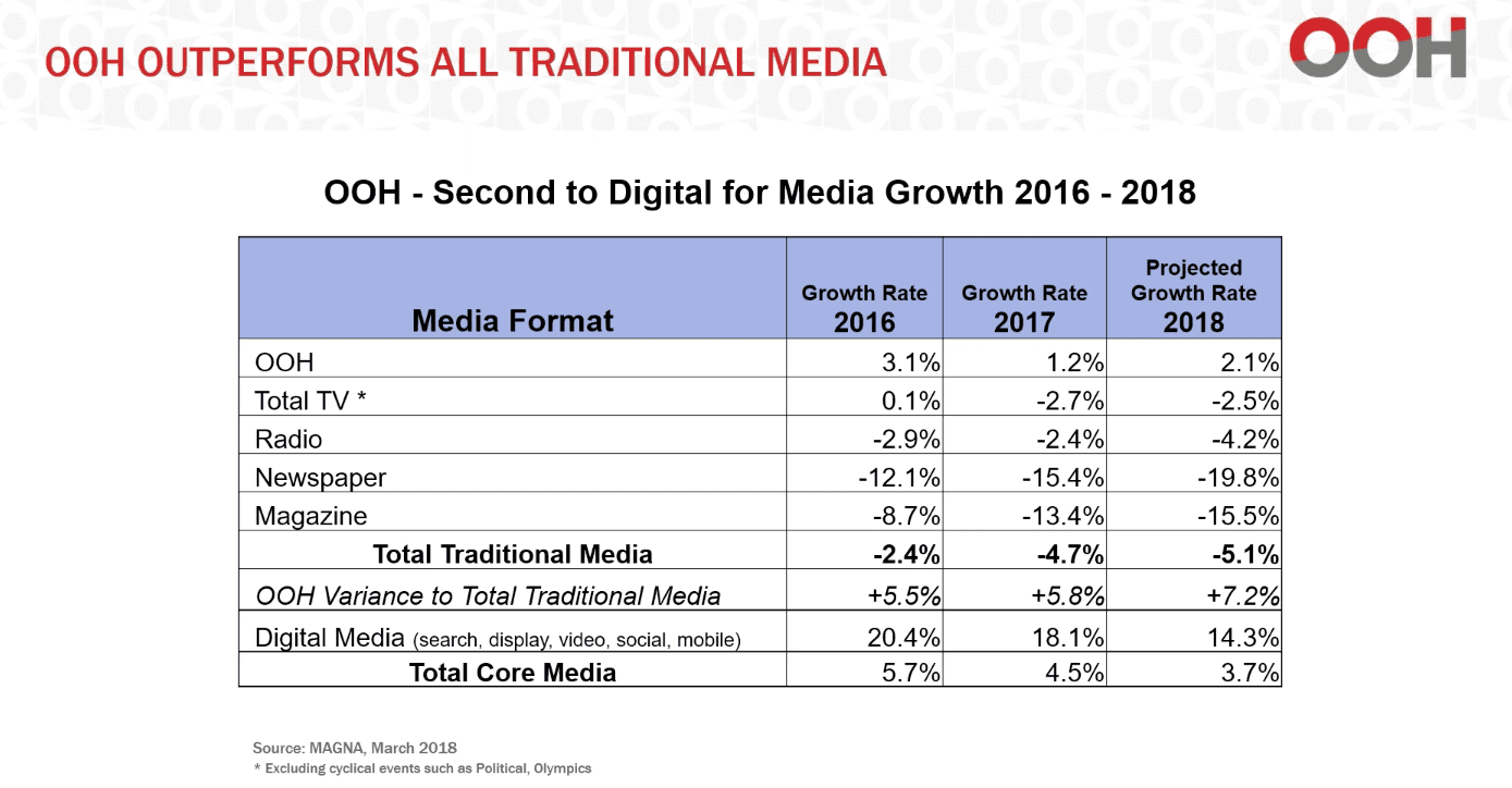 Insider listened to OAAA VP-Marketing Steve Nicklin’s agency presentation last week. Steve has given the presentation on the value of out of home to over 458 ad agencies. Steve showed this slide summarizing past and projected growth for out of home and other media.