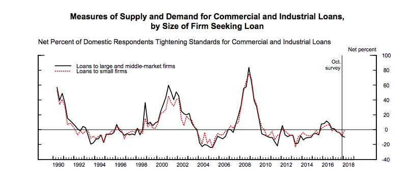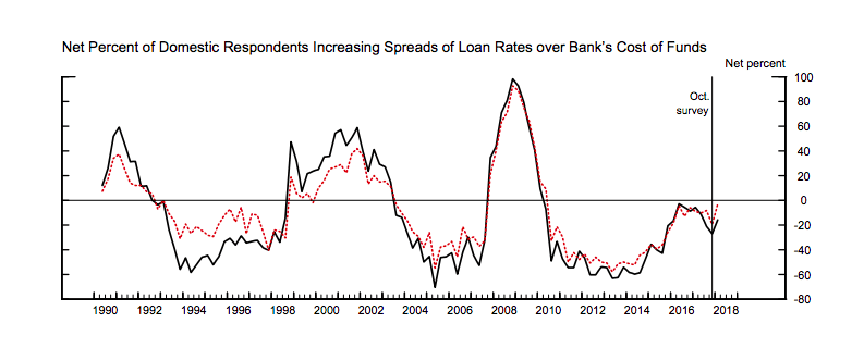 In response, banks are loosening credit terms and reducing loan spreads. Lower cost loans and easy credit terms will disappear when the economy sours. Here are two tables from the February 2018 Federal Reserve national survey of senior bank loan officers. The first chart shows the net percentage of banks which are increasing loan rates. Most banks have been decreasing credit spreads (i.e. lowering the price) for the past 8 years due to competition from non-bank lenders.
