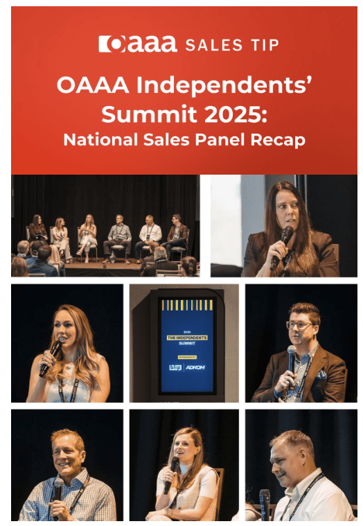 OAAA held its inaugural Independents’ Summit at this year’s OOH Media Conference in Boston. Sponsored by Blip/Adkom, the Summit focused on audience measurement, national sales, and programmatic. This Sales Tip is the third and final review of the three Summit panels.