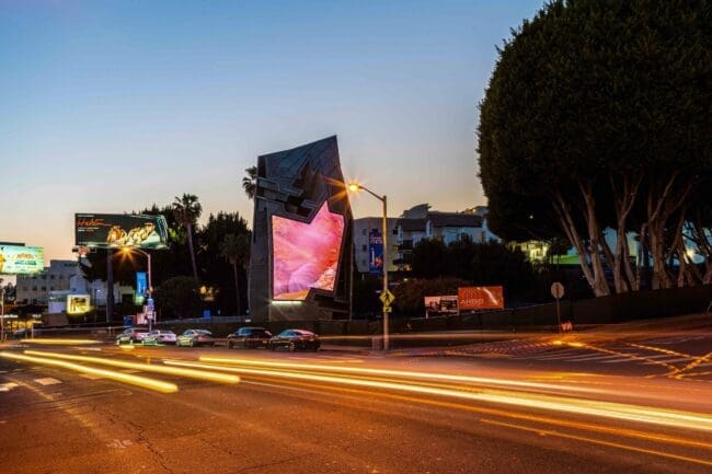 Following a juried design competition with submissions by world-renowned architects including Zaha Hadid and Gensler, the City of West Hollywood selected the team of OBM and Los Angeles-based Tom Wiscombe Architecture to create the most architecturally and technologically advanced billboard in the U.S. The Sunset Spectacular is the result of an over five-year process and is the first digital out-of-home media on the storied Sunset Strip in over ten years. The project reflects the City of West Hollywood’s commitment to creative innovation that honors the rich legacy of billboards on the Strip.