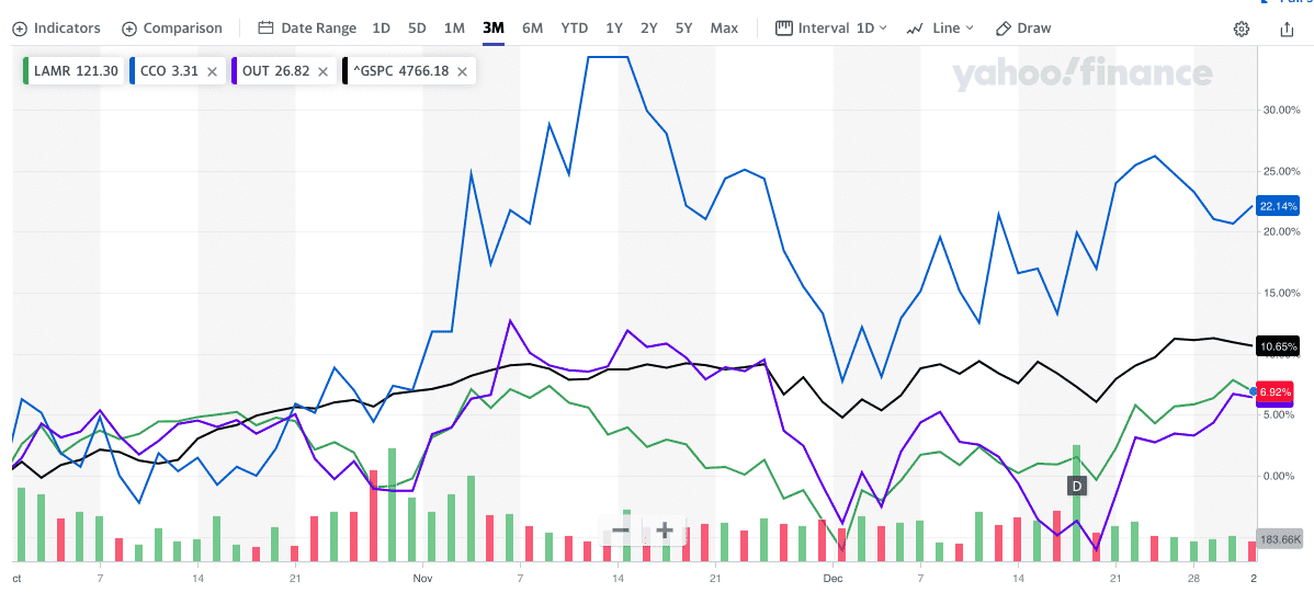 Stock performance of Lamar (green), Clear Channel Outdoor (blue) and OUTFRONT (purple) versus the S&P 500 (black) for the fourth quarter of 2021