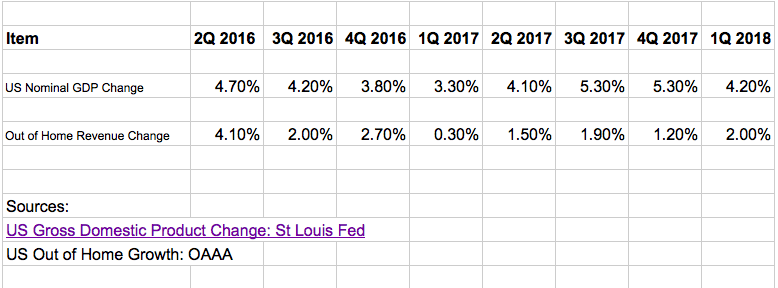 Gross revenue. This tells you how well your sales effort is going. You might also want to track your revenue versus the OAAA reported industry revenue to see if you are outperforming the industry. Here’s the revenue trend for the US out of home business for the last 8 quarters.