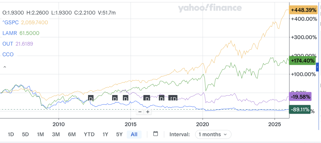 The numbers look different when you look back 20 years. The S&P 500 is up 448%. Lamar is up 174%. OUTFRONT is down 20%. Clear Channel Outdoor is down 89%. All three out of home companies have fallen farther than the market after the 2009 great recession and covid and have recovered slower from each event.