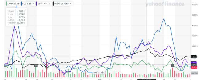 A year to date analysis shows that out of home stocks have recovered 35-75% of their covid losses but are trailing the Standard and Poors Index. The S&P 500 index is up 4% year to date. Lamar has recovered the most and the fastest from covid. It’s stock is still off 25% year to date. OUTFRONT is down 44% year to date. Clear Channel Outdoor is down 65% year to date.