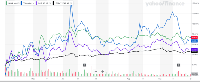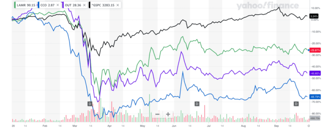 Public out of home stocks compared to the S&P 500 for quarter ended September 30, 2020 Lamar (green), OUTFRONT (purple), Clear Channel Outdoor (blue), S&P 500 (black)