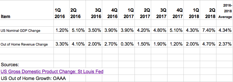 This week’s announcement of 4.7% growth in US out of home revenues during 2Q 2018 was good news. It was the highest quarterly US out of home growth in two years and represented the 33rd consecutive quarter of US out of home revenue growth. US out of home revenues, however, are not growing as fast as the US economy. Here’s the data for the past 10 quarters.