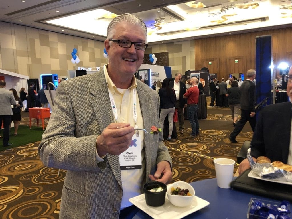 Insider snapped this photo of IBOUSA General Manager Chris Cowlbeck eating vegan at the OAAA 2019 show. Cowlbeck tells Insider that the food is surprisingly good. He says there will be vegan food at the next IBOUSA convention along with morning yoga and a gestalt workshop called “Billboards and you” which will include body work, dance and art.