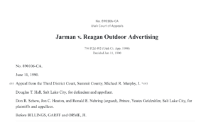 - In 1987 the State of Utah acquired a right of way from the Jarmans and asked Reagan to move the signs off the right of way.