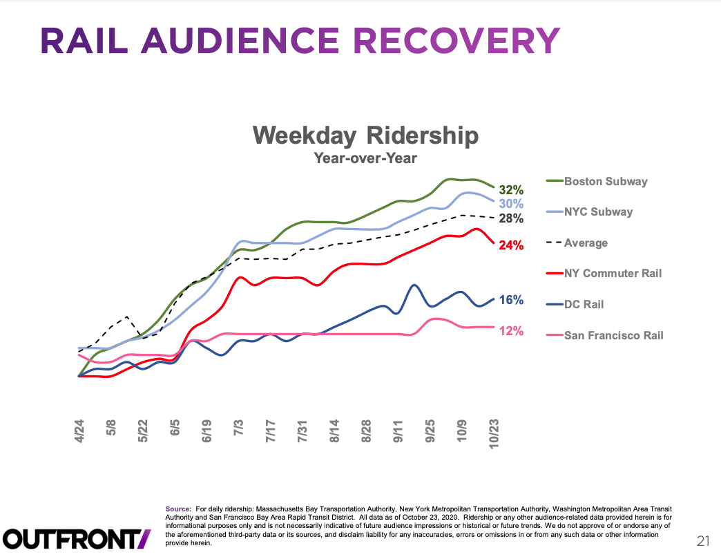 - Revenues declined 39% to $282 million during the third quarter of 2020 as primarily because transit revenues are lagging due to low ridership. Billboard revenues were down 23% while transit revenues were down 72%. Jeremy Male said that company expects revenue to be down by 30 percent in the fourth quarter of 2020 but ridership and revenues will recover as a covid vaccine becomes available. The company’s earnings deck contained a slide which shows that weekday ridership is running at only 12-30% of normal levels in places where it has it’s transit plant.