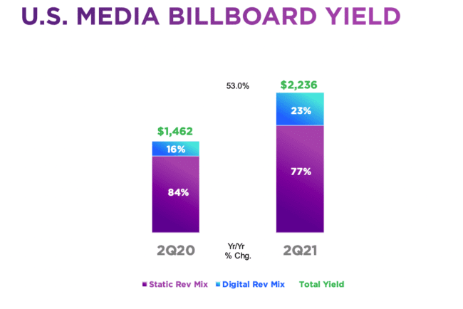- OUTFRONT’s average billboard yield increased from $1,462 during the second quarter of 2020 to $2,236 during the second quarter of 2021.