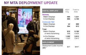 - The company spent $37 million in cash to add 610 station displays and 1,302 in car displays under its MTA Subway and Commuter Rail agreement. Here are the totals so far.