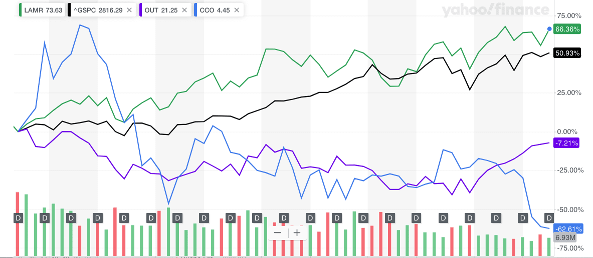 Here’s the chart. OUTFRONT is purple, Lamar is green, the Standard and Poors 500 is black and Clear Channel Outdoor is blue.