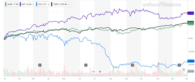The first table shows the 2019 stock performance of OUTFRONT (up 47%), Lamar (up 29%), the S&P 500 (up 29%) and Clear Channel Outdoor (down 43%).
