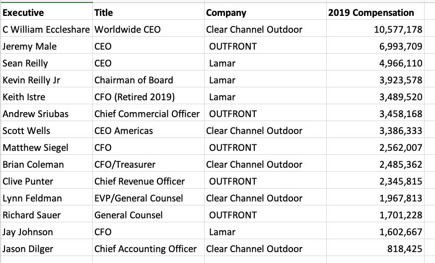 The second table shows the 2019 compensation of Lamar, OUTFRONT and Clear Channel Outdoor executives.