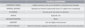 The political sales landscape has similarities to general market advertising, but can also be very different as generalized in the chart below.
