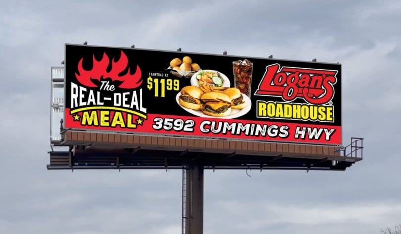 - This ad promotes a meal deal at a steakhouse chain. It’s a bit choppy and difficult to read for a target audience cross-reading it at 75 mph, which is how this ad is positioned in the marketplace.