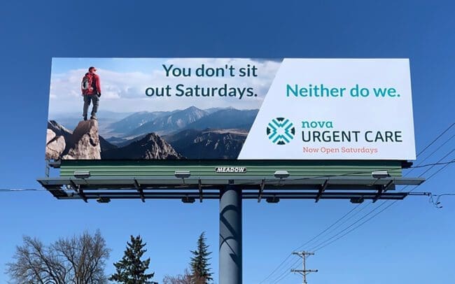- This billboard works up close but not from afar. I’d increase the size of the font, logo, and now open Saturdays.