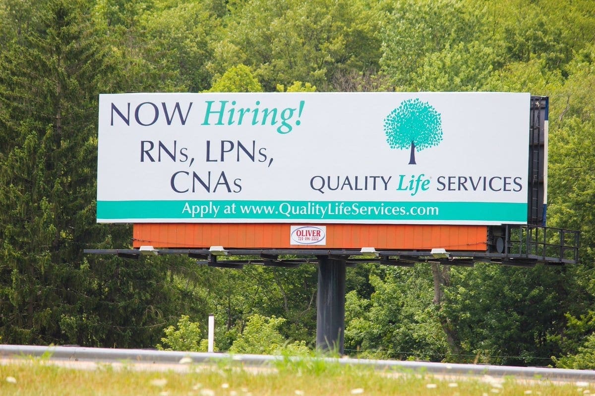 - This board represents the typical “Now Hiring” ad I encounter, especially for the medical industry. Big logo, big headline, itty-bitty contact info.