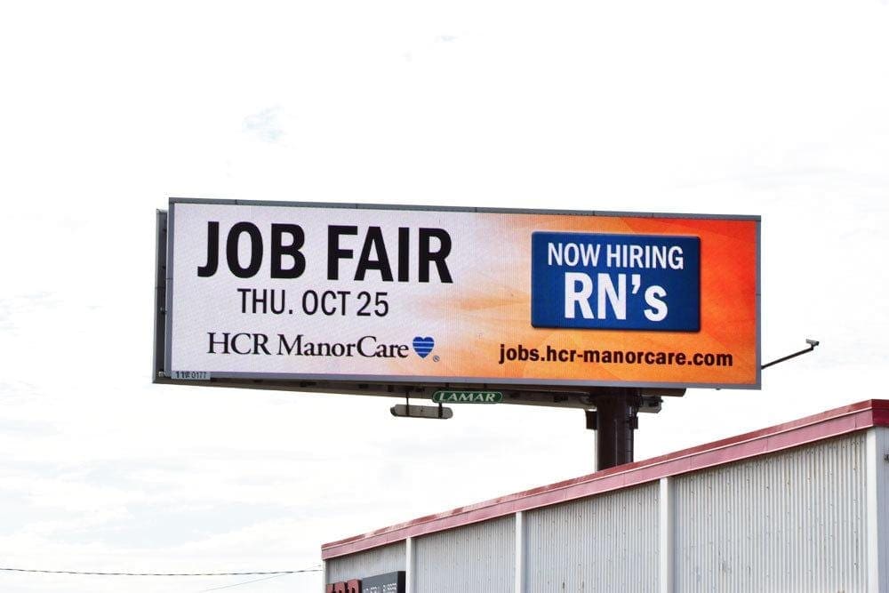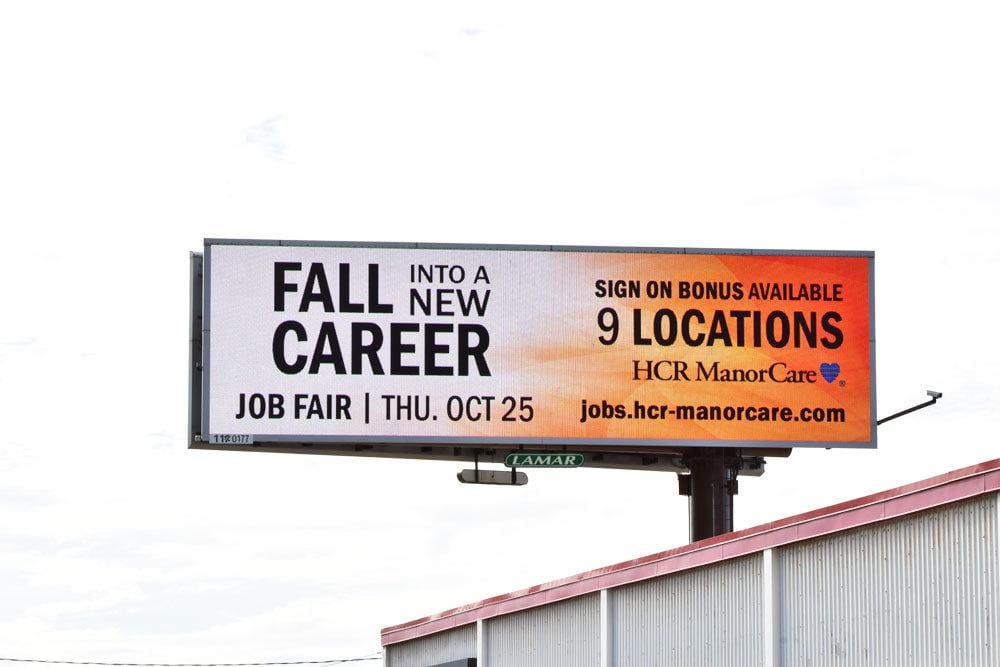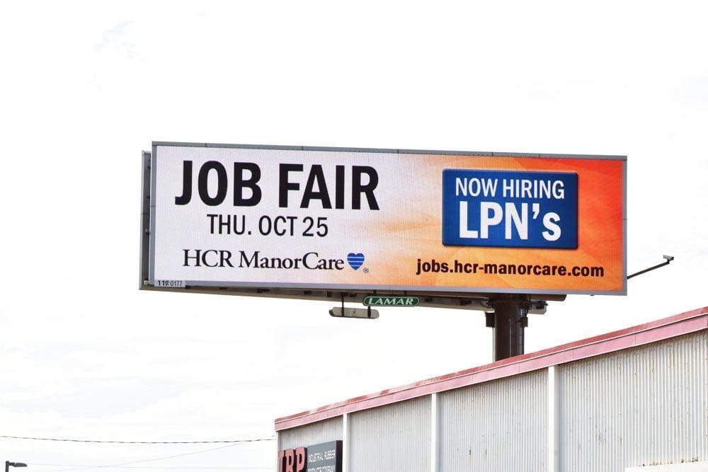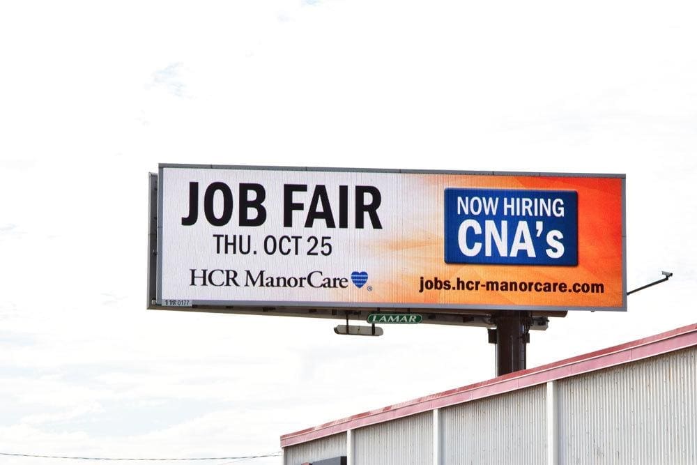 - HCA ManorCare used one board as a lead in to draw attention to the job fair and each of three additional boards to focus on a particular job to be filled. The target market was sure to see their particular skill set highlighted in the big blue box.
