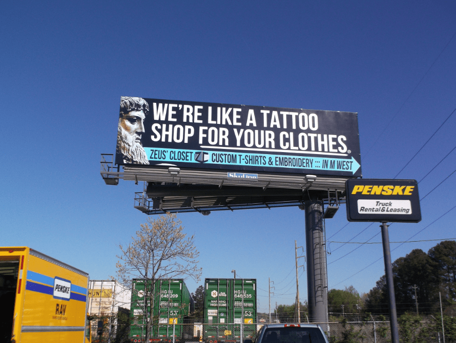 - This board for Zeus’ Closet has a headline that’s easy to read and an arrow that points to the right. And that is about all the target audience is going to get from this ad.