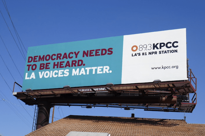 - This ad for KPCC is a simple design relying on color blocks and block text to convey the message. Contrast increases legibility when designing outdoor and this illustrates that truism extremely well.