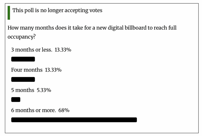 Here are the results of Billboard Insider’s reader poll on digital billboard lease up and occupancy.  A large majority of Billboard Insider readers said it takes 6 months or more for a new digital billboard to get to full occupancy.