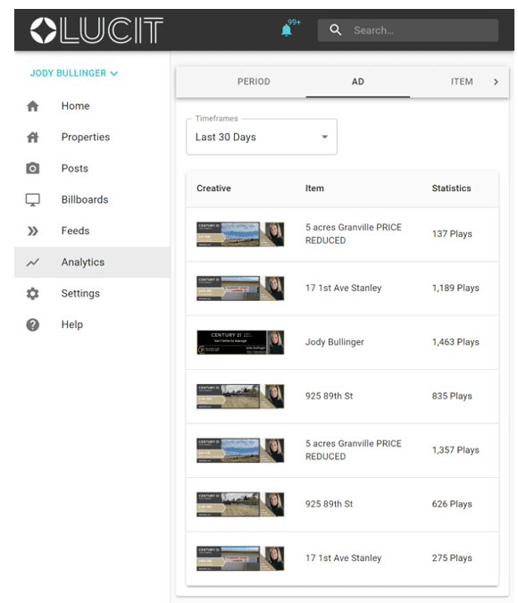 Another feature of the app that’s been a fan favorite is the analytics feature. The norm for the digital billboard industry is that advertisers will receive statistics on their ads once a month or upon request. Lucit offers a much better solution in the app for users to quickly pull up their stats sorted by overall campaigns, individual creatives, specific inventory items, etc. Pictured below is one of the variables app users can sort by, ’Stats per Creative.’ With this built-in feature, realtors can take a screenshot of the digital billboard image that contains their client’s home listings and send it to their clients to show that the homeowner’s hired realtor has advertised their home for sale on billboards 1,000 times in the last 30 days.