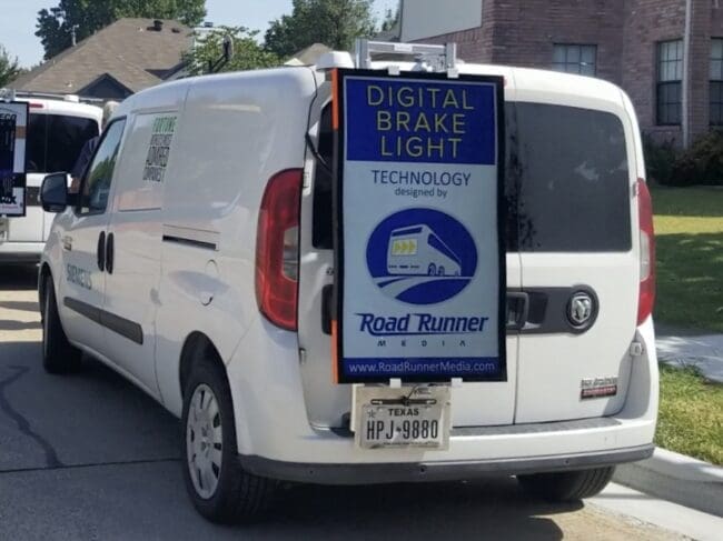 Road Runner screens feature the company’s patented Vehicle Operational Indicator (“VOI”) technology. The VOI integrates with the driver’s cockpit to allow the connected screens to act as a 46” high-resolution, LCD Digital Brake Light, alerting surrounding drivers when the vehicle operator brakes, selects turn signals, reverses, or activates emergency flashers. The Samsung ruggedized screens are highly visible day and night. When vehicle operations are not displayed, the screens can display a wide range of content, from brand advertising to Amber Alerts or any other critical public safety information.
