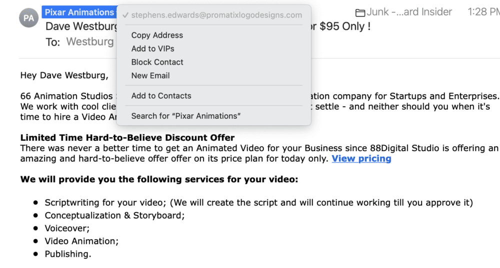 - Look for unusual email addresses when you hover over the from line in the email. It’s not from a digital billboard scammer but look at this email which ended in Insider’s spam box. The From line says Pixar Animations, but when you right click on Pixar Animations you can see that the sender has nothing to do with Pixar.