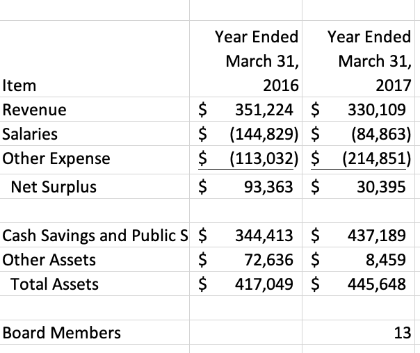 Insider thought you might want to see the financials for Scenic America, the anti-billboard non-profit. He gleaned these facts from reviewing Scenic America’s 990 for the years ended March 2016 and March 2017. The figures below are for Scenic America’s national organization, not for the individual state chapters.
