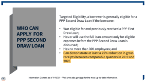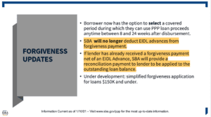 One other item we noted and highlighted below, focuses on those businesses that applied for an EIDL disaster relief grant (typically capped at $10,000). In the forgiveness application, if you received an EIDL grant and the full amount available to you on a PPP loan application, you were obligated to reimburse the grant as a part of your forgiveness application. This new round of funding removes the provision of deducting EIDL advances and allows a company who may have already reimbursed their EIDL advance to have a path to get that payment refunded.