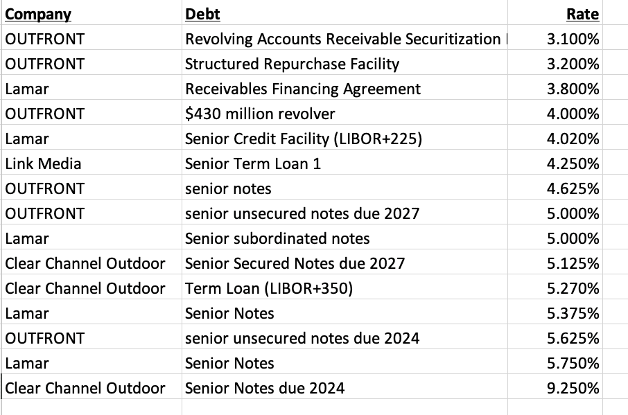 Insider thought you might want to see how this note issue stacks up with the senior debt of the other public out of home companies. As you can see from the debt table Clear Channel Outdoor has the most expensive debt because its leverage is well above Lamar or OUTFRONT. The higher priced debt also tends to have a longer maturity. Receivables based facilities and 1-2 year revolvers are the cheapest debt.