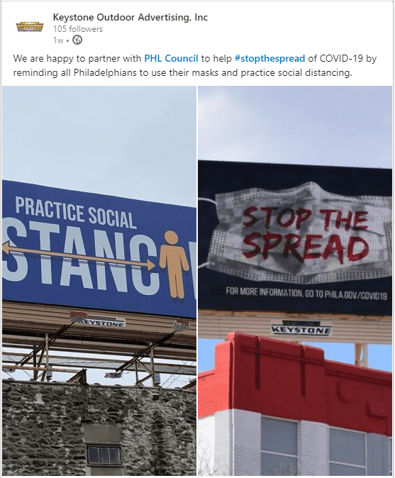 Kudos to Keystone Outdoor is partnering with the Philadelphia City Council on a billboard campaign to promote mask wearing and social distancing.