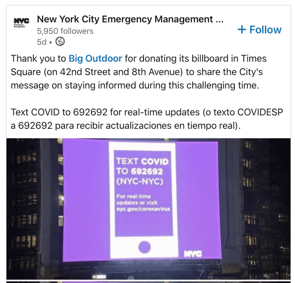 Big Outdoor is running a coronavirus PSA on its Times square billboard.