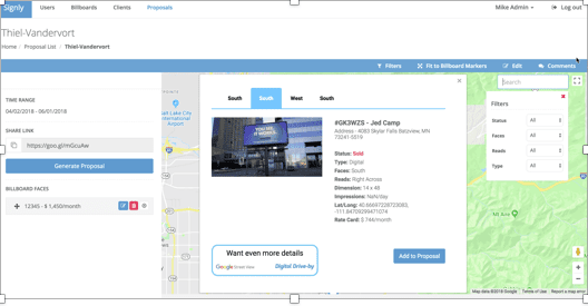 Signly leverages new technologies to make a painless experience for you while also moving billboard sales into a new era with online proposals and shareable links and our brand new “Digital drive by” which completely eliminates the need for time consuming billboard drives.