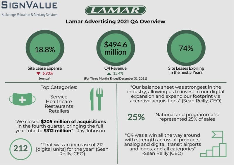 SignValue’s Big 3 at a Glance – Fourth Quarter 2021 March 1, 2022 12:05 am Views: 680 SignValue has prepared infographics summarizing the performance of Lamar, OUTFRONT and Clear Channel Outdoor during the fourth quarter of 2021. [wpforms id=”9787″] Paid Advertisement