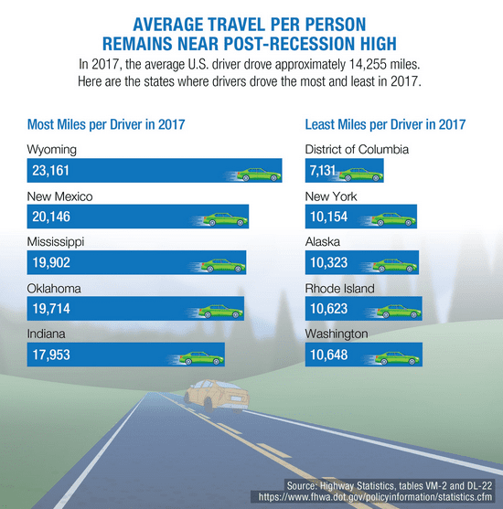 Good news if you’re an out of home company in Wyoming, New Mexico, Mississippi, Oklahoma or Indiana. You’re in one of the top 5 states in miles driven per driver. More miles on the road means more billboard impressions. Look at this graphic from the Federal Highway Administration.