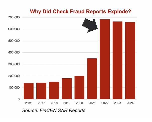Billboard Insider recently sat in on a seminar where fraud investigator Frank McKenna said this:”Putting checks in the mail is a very bad idea right now.” Check stealing is the number one source of financial fraud. Look at this chart which tracks check fraud reported to the US Treasury’s Financial Crimes Enforcement Network. Check fraud reports have almost quadrupled since 2020.