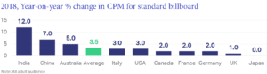 WARC projects the following CPM increases for billboards across the globe in 2018. The US is projected for a healthy 3 percent increase, but that still falls short of the global average of 3.5 percent.