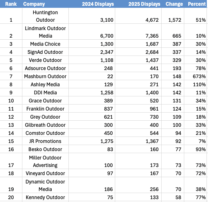 - We computed the list by comparing the number of faces each company had in 2024 and 2025. See Billboard Insider’s 2025 list of US roadside billboard companies ranked by faces and Billboard Insider’s 2024 list of US roadside billboard companies ranked by faces.