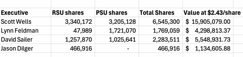 In addition, Clear Channel Executives and employees will receive $116 million in compensation from 27 million restricted stock units (RSU’s) and 21 million performance stock units (PSU’s) which vest and are paid at closing at $2.43/share. Here’s our calculation of how much of the $116 million goes to Clear Channel Outdoor executive officers.