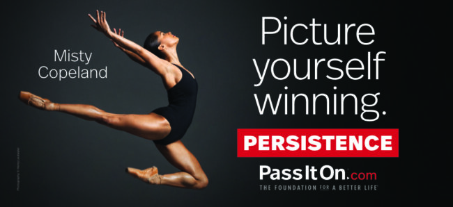 For Misty Copeland we read an interview of hers where she said “imagine yourself winning.” And I thought in today’s challenging times we sometimes imagine ourselves with problems. And yet, here is this individual who has dealt with significant life struggles giving us glimpse of what is possible—winning! Misty went from living in a shabby motel room with five siblings to performing professionally in just over a year. Henry Leutwyler, the photographer said, “Her leap for this photo was not from a trampoline , she came off the floor.” The shot is breathtaking.