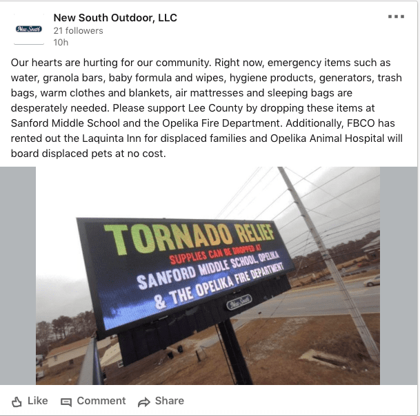 Tornados damaged parts of Alabama this week. Neil Bell tells Insider that New South Outdoor’s Auburn plant was undamaged but the company used its digital signs to do lots of public service advertising.
