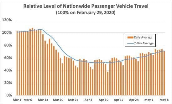 US travel continues to rebound according to the INRIX U.S. National Traffic Volume Synopsis Issue #8 (May 2 – May 8, 2020). Here are the highlights.