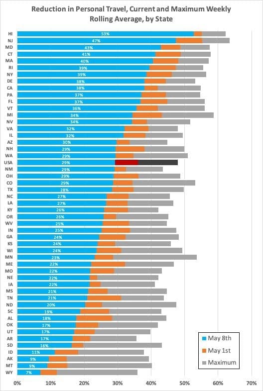 - Travel increased in every state compared to last week, for the third week in a row, with all states increased at least 2%. Nebraska and Hawaii had the lowest increase, 2% each. Three states increased more than 10%, Alabama (11%), Maine (10%) and Tennessee (10%). 40 states in total increased 5% or more this week. Figure 2 shows each state’s weekly rolling average on May 8th in blue, last week’s (May 1st) in orange, and the maximum drop at any point from March 1st in gray.