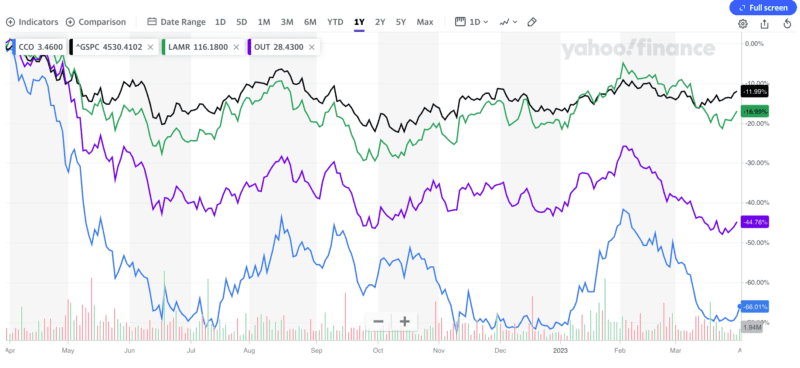 Clear Channel Outdoor (blue), S&P 500 (black), Lamar (green) and Outfront (purple) stock performance for 12 months ended March 31, 2023