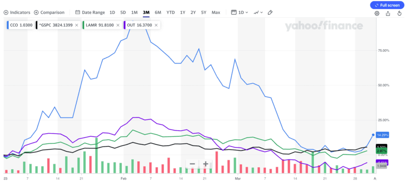 Clear Channel Outdoor (blue), S&P 500 (black), Lamar (green) and Outfront (purple) stock performance for 3 months ended March 31, 2023.