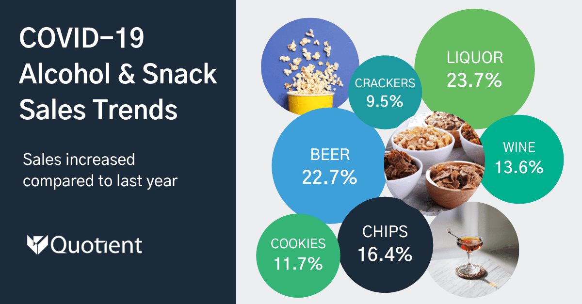 This past year has caused a shift in consumer behavior. Instead of happy hours at local bars, we are celebrating with virtual cocktail hours. We have traded out in-office snacks for mid-day raids to our own kitchen cupboards. Quotient’s data shows that both alcohol and snack sales have increased during COVID as people seek comfort and enjoyment while social distancing at home.