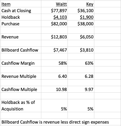 - Now’s a good time to sell if you’ve been having thoughts about liquidity. Lamar said last week it wants to pay 10 times forward EBIDTA for assets it buys. Link paid an average multiple of 10.98 and 9.97 times billboard cashflow for Waitt and Key. These multiples will contract if we hit a recession.