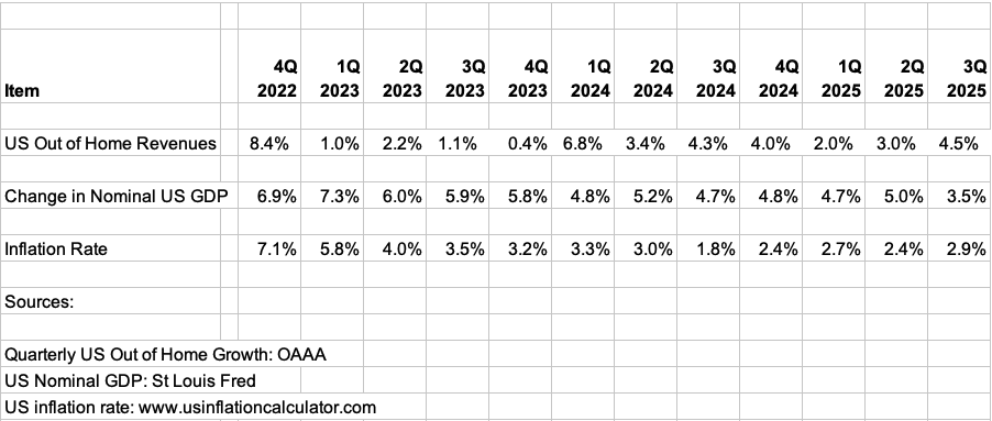 The US out of home industry grew faster than the US economy and faster than inflation during the third quarter of 2025. US out of home revenues increased 4.5% compared to projected growth of 3.5% of the US nominal gross domestic product and 2.9% for US inflation. This marks only the third time in the past 12 quarters that US out of home growth has exceeded the economy. Maybe we should be calling out of home a GDP business as opposed to a GDP-plus business.